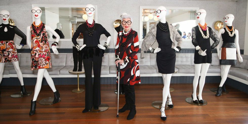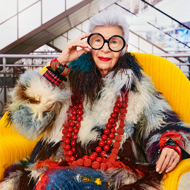 Iris Apfel本身不是時裝人,她是一位室內設計師,不過一直生活在多姿多采的世界,而且天生愛時裝。Iris Apfel經常與不同團體或品牌合作,更在上年她與Macy’s 合作推出了共40年的時裝Iris Meets INC系列。除了與Macy’s合作外,也曾與HSN及Wise Wear合作推出首飾系列。