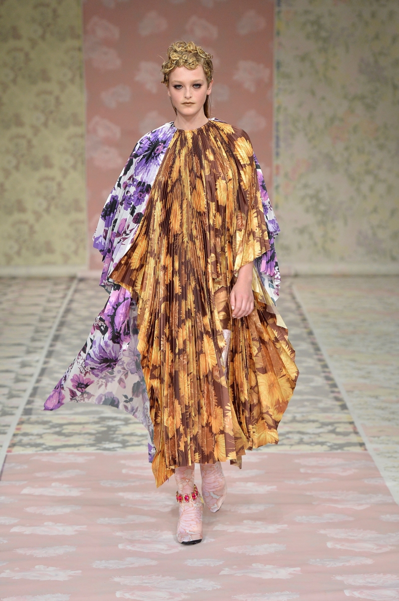 Richard Quinn 2018秋冬新作當然很「花」,不少飄逸長裙、大褸、絲綢頭巾及披肩等設計,當中運用了各式金篛質感、雙面等等印花技巧,盡情表達英倫活力。女王睇騷時不時與女魔頭交頭接耳,想是頗 enjoy,可是騷末她沒有拍掌,因為這是皇室規條(攤手)!