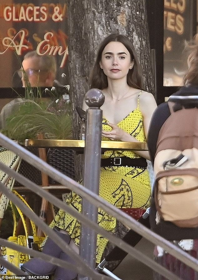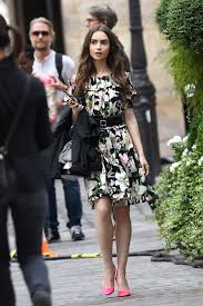 Lily Collins在劇中曾穿過多款碎花連身裙,如Dolce & Gabbana的一字膊款,除了不少得Christian Louboutin的高跟鞋,她亦用上皮帶以強調腰線,令雙腿視覺上更修長。