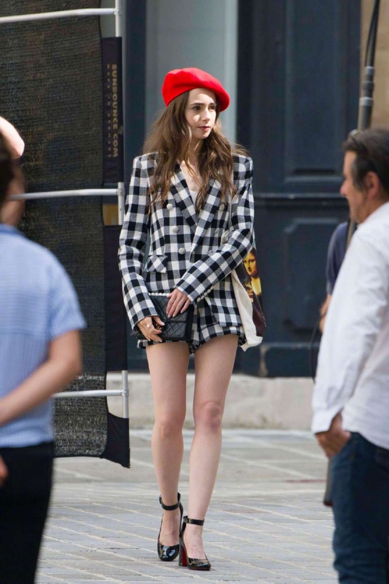 上班造型不少得西裝褸及西褲,不過對於身型嬌小的女性來說,揀選短裙或短褲配襯西裝褸才是絕配,Lily Collins就穿上Veronica Beard 的黑白格仔西裝褸及同款短褲,再穿約三吋半高的Christian Louboutin 搭帶高跟鞋,既簡約時尚,又更添活力感,短褲亦可拉長雙腿比例!Lily Collins更用上已斷貨的2020春夏Chanel珍珠flap bag,亦加上紅色畫家帽配襯,更顯法式復古時尚。