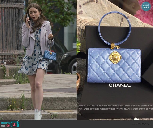 天氣轉涼時,可加一件皮褸作配襯,Patricia Field為Lily Collins選上粉紫色調的IRO 皮褸,比普遍的深色皮褸更顯女人味,更適合上班造型。Lily Collins這身造型更以紫及藍兩色配搭,藍色的Chanel手袋亦相當受注目,可惜同樣售完。加上白色Vivienne Westwood的ankle boots,增添玩味時尚感。