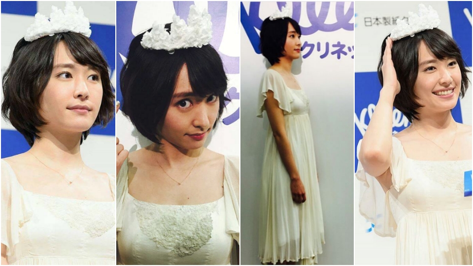 日本國民女神結衣bb當上一個紙巾品牌的代言人,她出席活動時戴上用紙巾摺的皇冠,配襯全白的雪紡裙子,女神氣質大爆發!其實紙巾的可塑性極高,除了可以摺出「女神的冠冕」,更可以造出華麗的婚紗!