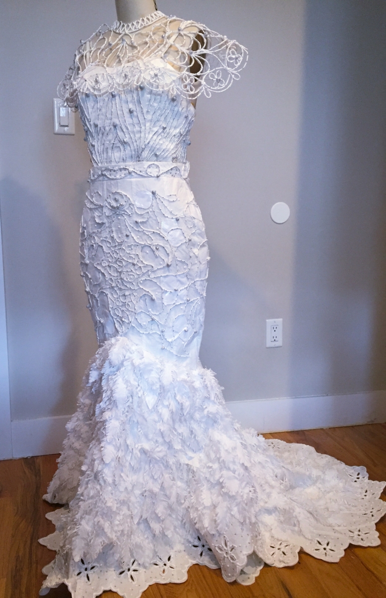 本地婚紗設計師Noel Chu都曾經創作了一系列的紙巾婚紗,她用紙巾造出的花朵細節非常精緻,而且以層疊的方法可以模仿布料的層次感,再加上閃片、珍珠等材料,令婚紗的整體感覺更高貴。