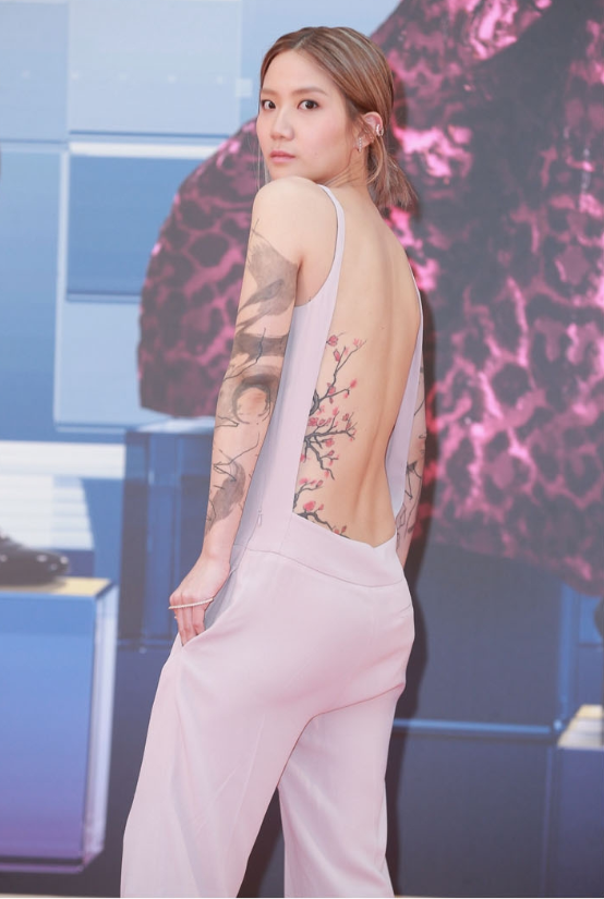 別以爲露背只是「性感」的代名詞,前At 17唱作歌手盧凱彤便向我們展示了原來露背也能這麽型格!一身pastel粉紅的連身褲與她充滿藝術感的紋身出奇地合襯,配合她中性的妝容,使她個性盡顯。