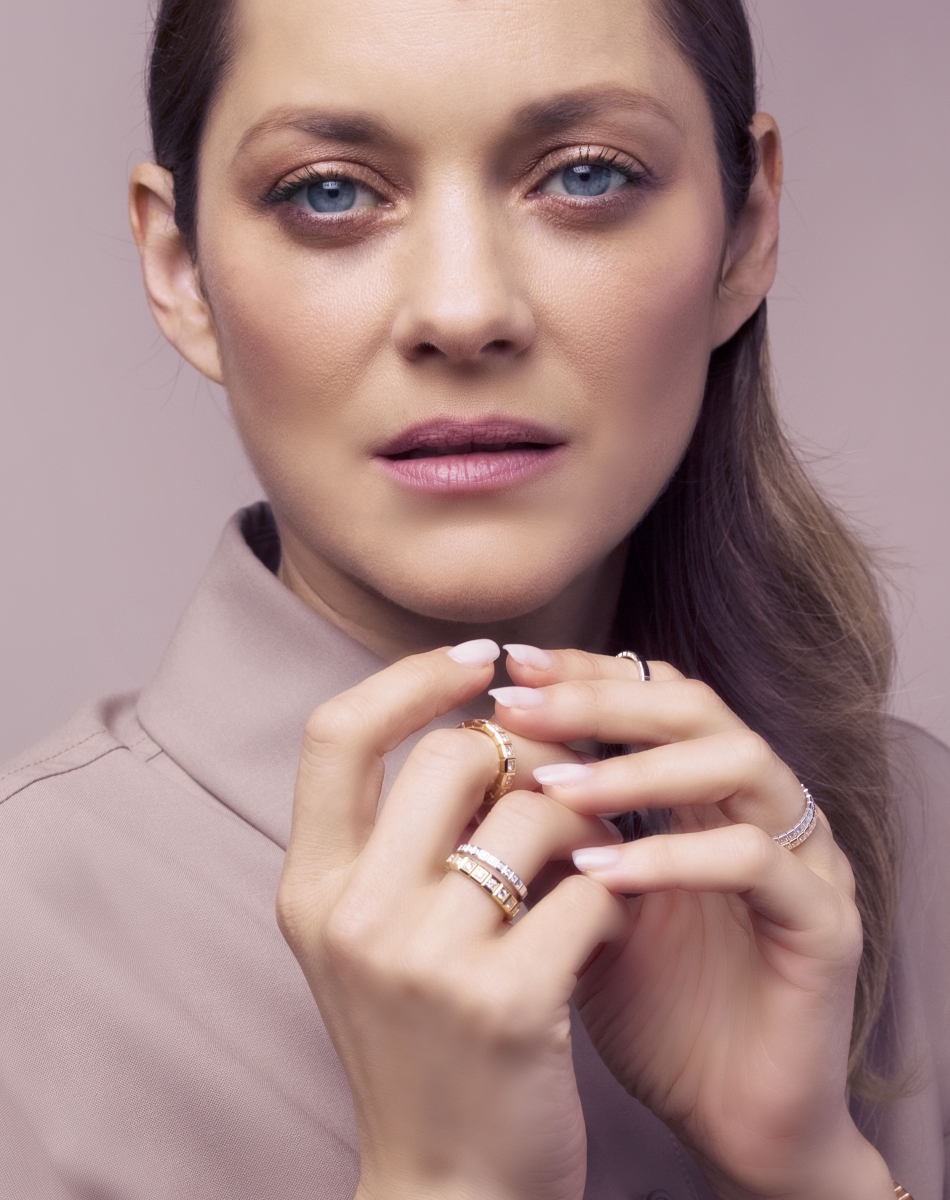 Ice Cube系列以精工細作的方形琢面組成,宛若冰塊一般晶瑩剔透、簡約優雅,能夠展現獨特的個人風格。戴在Marion Cotillard無名指上的戒指獨具幾何美感,工匠採用符合倫理道德標準的金原料與精緻的工藝打造而成。高雅的Marion Cotillard以富有魅力的沉思表情凝望著遠方,攝影師就在那一剎以快門捕捉了她不斷追求,並創造自己的世界的渴望。