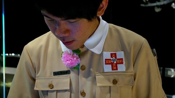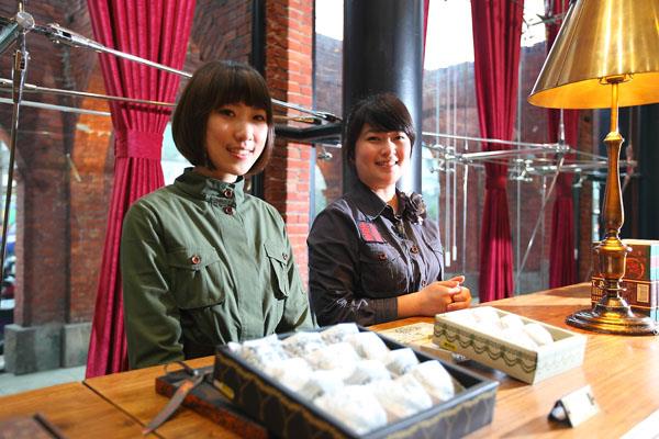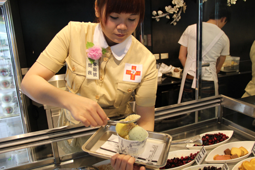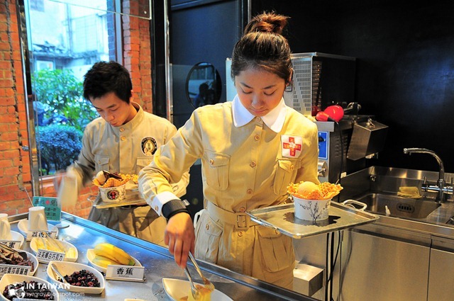 「宮原眼科」前身是醫院,員工制服當然少不了護士服,不過這款護士服並不是當代的款式,而是類似二戰時期日本軍隊護士的服裝。全身制服都採用素麻色調,上衣是有4個大口袋的長身恤衫,配上同色短褲、深褐色長襪和皮鞋,左邊口袋上方繡了「宮原眼科冰淇淋」的十字標誌。適逢母親節,有些員工的襟前更插上康乃馨,很有心思。