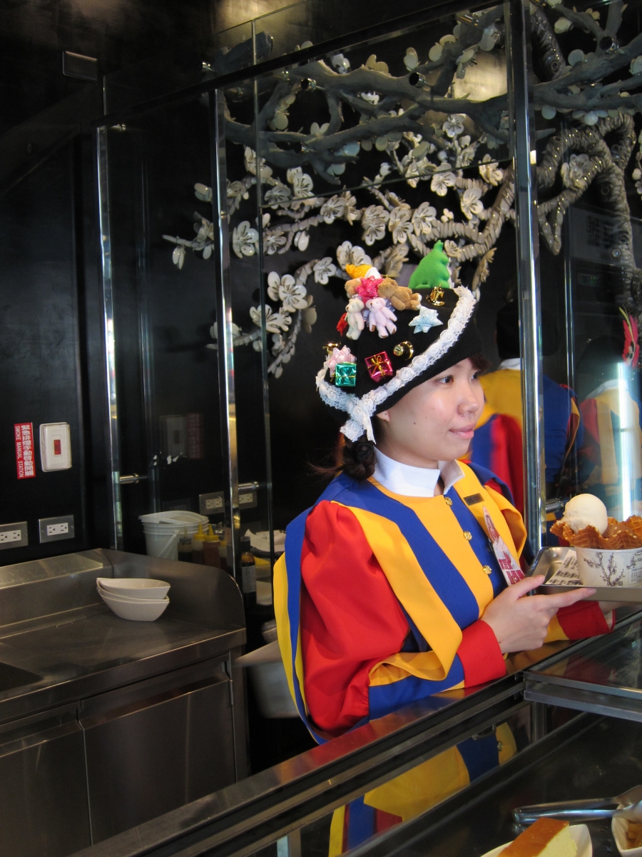 除了走日本風,「宮原眼科」的員工制服亦曾以梵蒂岡軍服作為設計靈感,以紅黃藍彩條制服配襯黑色貝雷帽。不過雖然是軍服,在「宮原眼科」的員工身上,卻沒有嚴肅的感覺,因為他們會在帽子上加入有趣的裝飾,如熊啤啤等,令整體感覺輕鬆好玩。