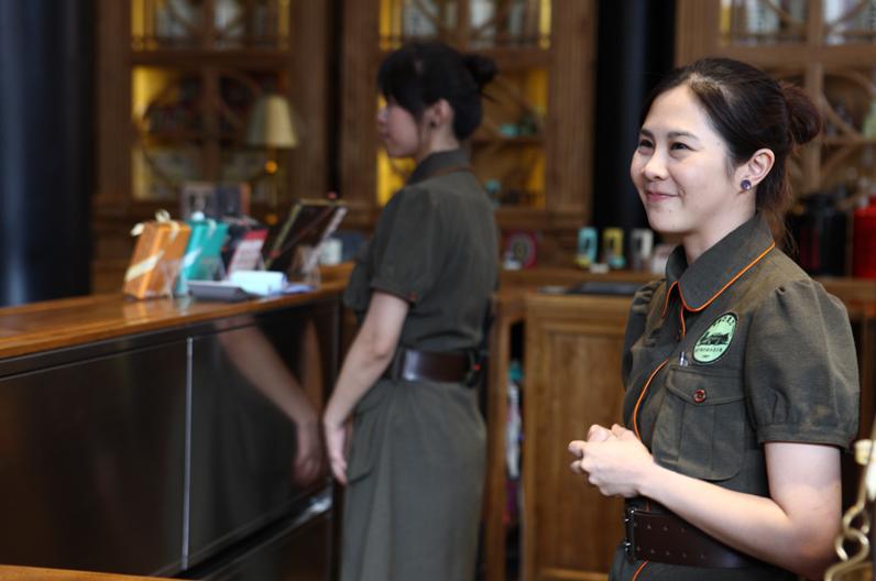 最近的員工制服走中性跳脫風格,以芥末黃色的西裝外套或短袖恤衫,配襯湖水綠色tie和短褲,黃與綠都是鮮明的顏色,十分切合夏日青春活潑的感覺。而且黃色加綠色令人聯想起原個新鮮鳳梨的模樣,而現正是台灣鳳梨的盛產期,制服與店舖的產品暗地裏match了!