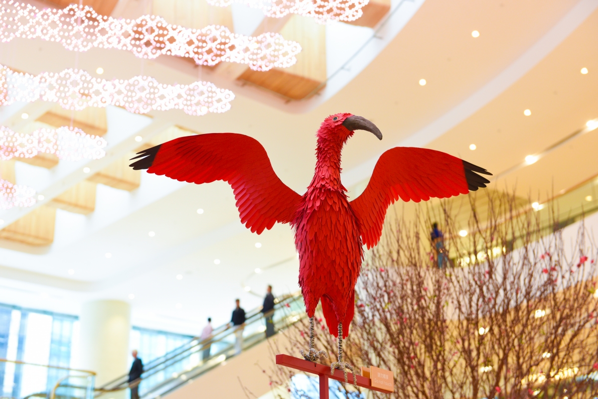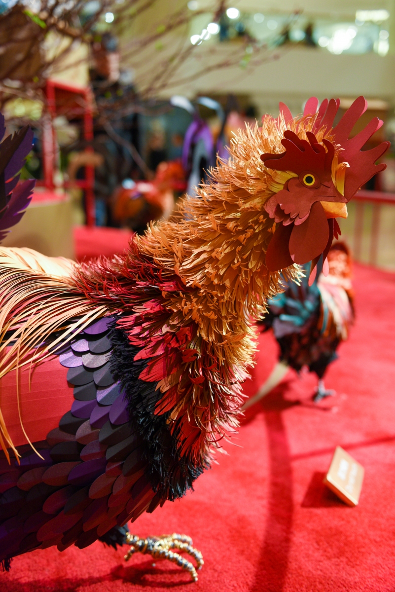 太古廣場請來居港英國藝術家 Pauline Yau 用色紙巧手創作30 座紙雕,活現公雞及雀鳥的獨特形態,帶來朝氣勃勃的黑銅馬朗公雞等多款作品。