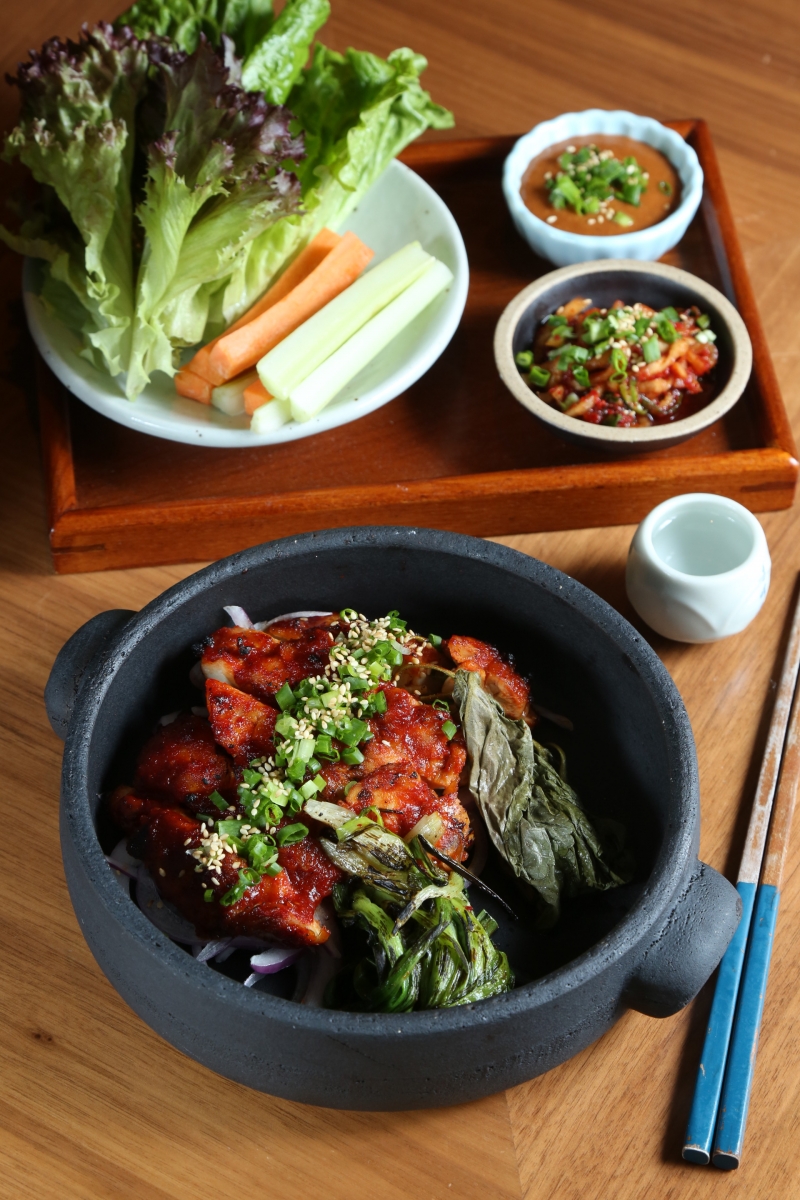 甜椒漿混入韓式辣醬後再塗上雞腿肉面層,在火爐上把雞腿肉炭燒,配上自家醃製芝麻葉、炭燒青蔥和洋蔥,或以生菜包的方式品嚐。