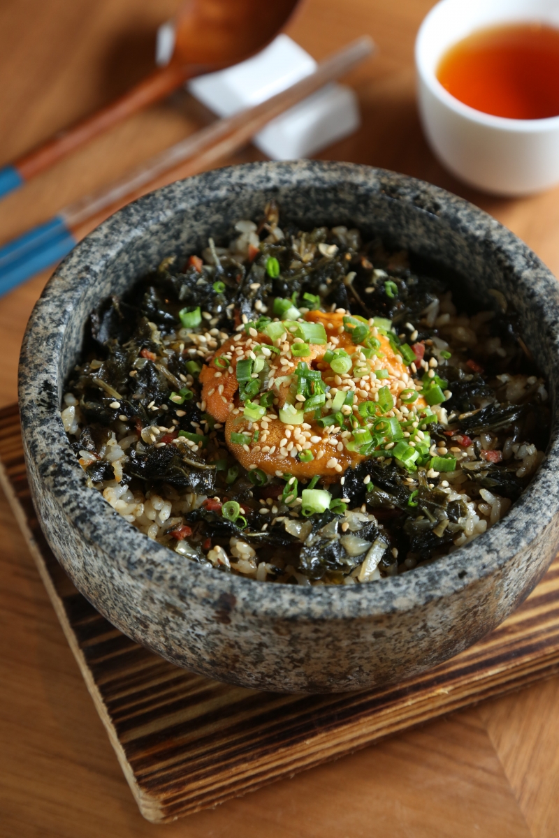 把Chwinamul菜乾配上西班牙辣肉腸、飯和醬油一起放進韓式石鍋內一起烹煮,飯香陣陣之餘,亦有種像港式臘味飯的口感。最後面層放上新鮮的時令海膽,令外表簡單的菜飯味道提升。