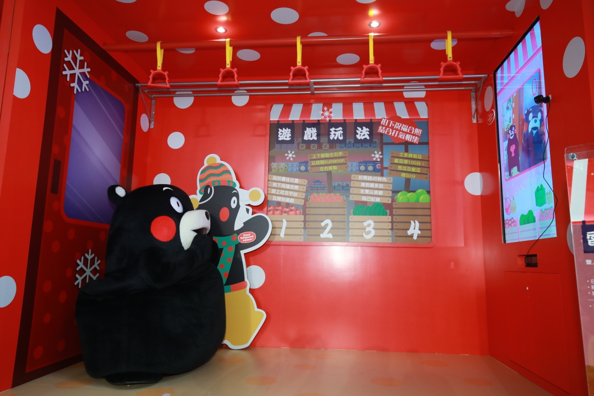 必影景點三:你亦可以登上熊本縣市區列車,與親民的Kumamon車長同遊景點和開心自拍,還有「Kumamon左摘右摘熊本水菓」聖誕版電子體感遊戲可以玩!