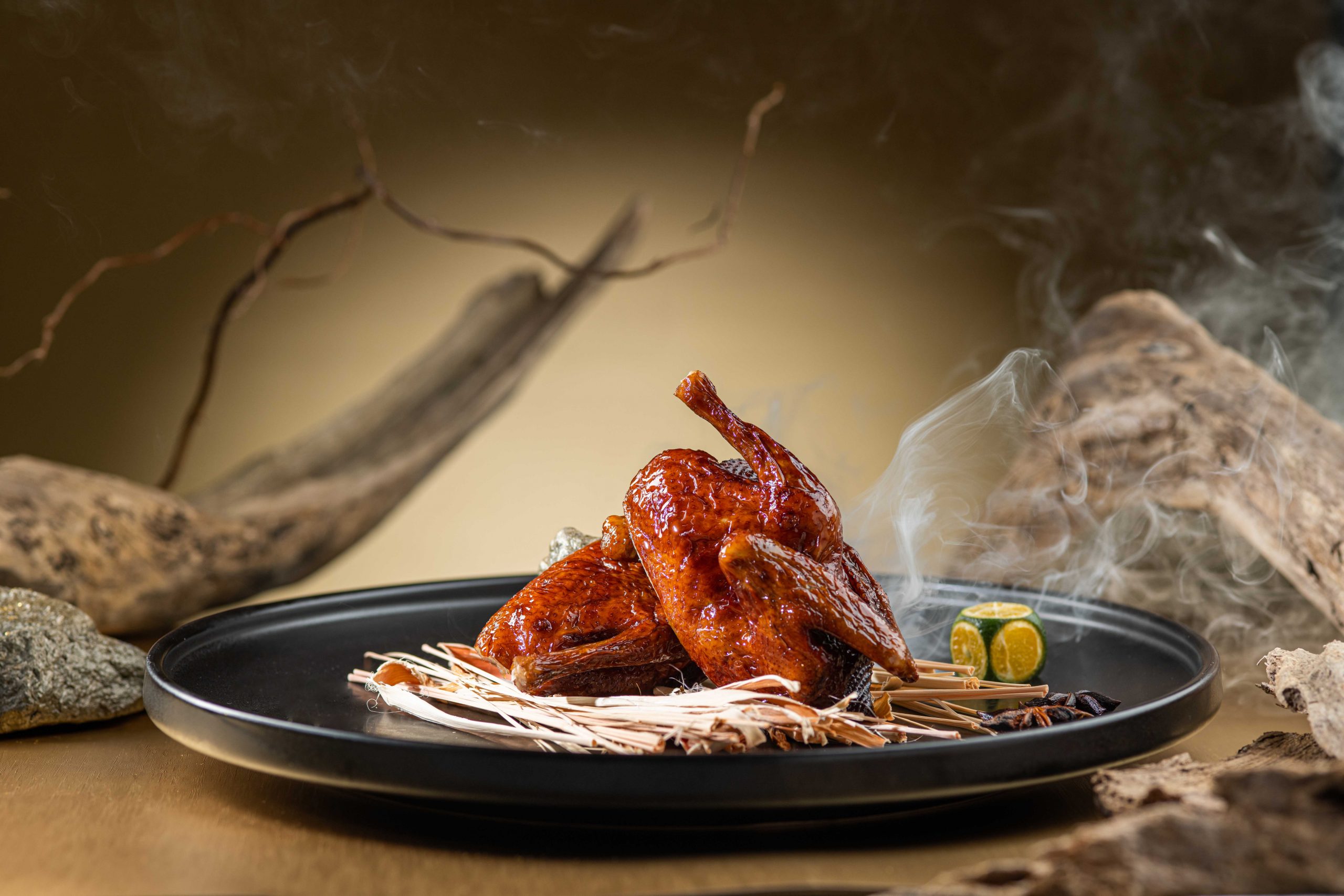 香芧茶燻雛鴿:以香芧浸泡雛鴿約45分鐘至入味,後以普洱茶葉煙燻再酥炸,一上碟燻香撲鼻,普洱甘醇滲透於肉中,雛鴿保持脆香肉嫩,色、香、味俱備。