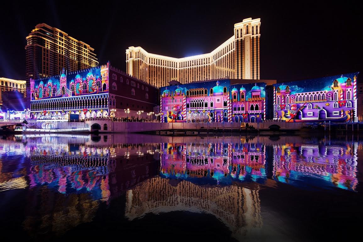 講到異國風情,相信好多人都會想起澳門的威尼斯人酒店。今年聖誕,威尼斯人的戶外人工湖畔區以光影投射佈置得七彩繽紛:不至有聖誕樹、還有非常「威尼斯」的玻璃裝飾和裝扮成貢多拉船夫的胡桃鉗子。隨著投射表演的進行,還可以看到很有夢幻的宮殿和聖誕木偶,很有聖誕童話的感覺。