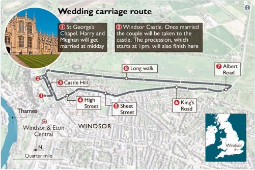 哈里王子與Meghan Markle於5月19日正式結婚,中午12時會在聖喬治教堂(St.George’s Chapel at Windsor Castle)行禮,然後下午1時會乘坐馬車遊行,路線會經過市中心High Street及於Long Walk折返。而Queen Elizabeth會主持午宴,宴請600多位賓客於Windsor Castle享用午餐。晚上則只會宴請200多位親密的親友們於Frogmore House進行晚宴。