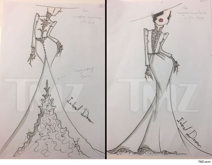 整個婚禮Meghan Markle會穿上2件禮服,婚紗典禮上穿著,另一件會於晚宴時穿著,兩件都會是訂製的。Wedding dress會是傳統與優雅並重,有袖及蕾絲點綴;而晚宴禮服則會是雍容華貴的款式。Meghan已經試穿了婚紗,當然還未定實最後會選中哪一位設計師的設計。而多位候選的設計品牌包括了Meghan好友Roland Mouret、Ralph & Russo、Burberry、Alexander McQueen、Erdem、Jenny Packham及之前婚紗草圖被傳媒露的Inbal Dror,不過有消息指出似乎第一個跑出的會是Erdem,估計Erdem已經在製作禮服中,而Erdem的浪漫設計是Meghan及Kate Middleton同樣喜歡的品牌,當然品牌還未有証實。當初有估計Victoria Beckham可能也是設計師人選之一,但Victoria已回覆未被邀請。