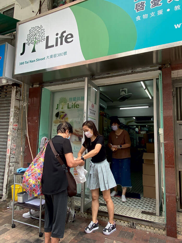 Elli 坦言自己最初的想法十分單純,辭去全職工作後,希望僅利用自己的一些積蓄,去營運一個社區中心,並先從食物派發 著手。「我知道坊間有許多剩餘的食物,啟 發我想到用食物作主打,收集這些剩餘的 食物、物資,再烹煮或轉派給有需要的家 庭、人士。」就是這樣,Elli 從銷售及市場 推廣的專材搖身一變成她口中的「Cooking Mama」。「到實際運作時才知道原來是這樣 不容易,我要從食物銀行、品牌收集食物, 然後再煮食、派發。而且從那時開始我已經 好相信『教育』的力量,所以我希望這些小朋友來到中心除了得到溫飽之餘,也可以同 時得到教育。所以我又會兼任導師指導他們 的課業,所有人離開後,我還要做清潔、收 拾,每日『朝 9 晚 11』,時間真的不夠用。」 到今日,食物援助依然是J Life Foundation 的重點項目,2019 年總共回收 了124,917 公斤的食物和資源,同年派發 40,320 次食物,平均每日有100-150 個家 庭受惠,而更難得的是就算在疫情期間,援助也不曾停頓過。